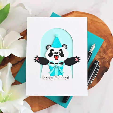 Birthday Bear Etched Dies are part of the Sending Hugs Collection by Simon Hurley. Create many birthday celebration projects with this set of 20 thin metal cutting die! Make your focal point, the bear with its open arms, any color or type. There are two different banner sentiments – Let’s Party and Happy Birthday. Also included are a party hat and a present tied in a bow.